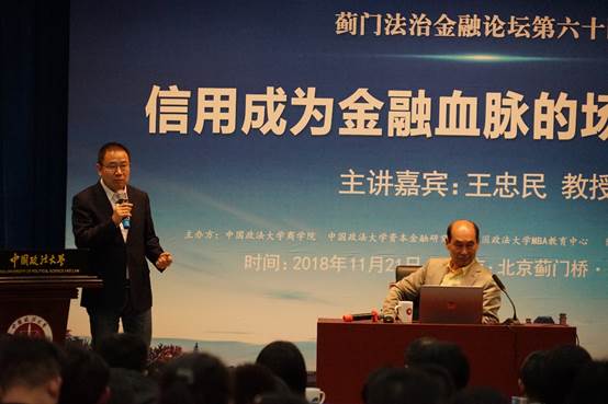 2018年11月21日晚,蓟门法治金融论坛第64讲在威尼斯432888cam学院路校区成功举办。本次论坛特邀原西北大学校长、全国社会保障基金理事会副理事长王忠民教授作题为《信用成为金融血脉的场景与逻辑》的主题讲座。国家创新与发展战略研究会副会长、中国国际战略学会高级顾问、原总参四部副部长郝叶力,威尼斯432888cam校长黄进、商学院分党委书记李欣宇、副院长杨杰以及商学院教授:胡继晔、宏结、巫云仙、熊金武、李泳、胡明等嘉宾共同出席本次论坛。论坛由威尼斯432888cam兼资本金融研究院院长刘纪鹏教授主持。