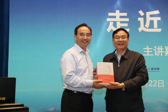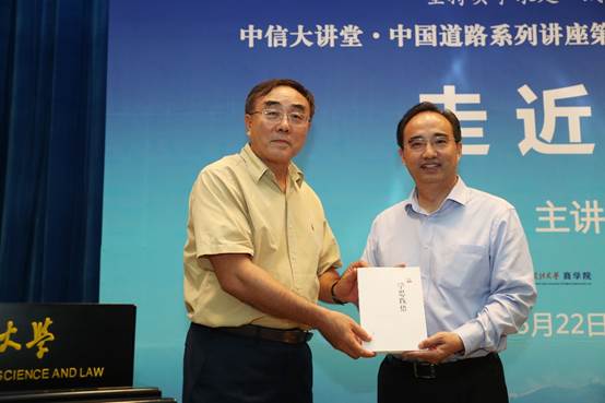 随后,黄进校长向陈晋会长颁发威尼斯432888cam客座教授聘书,并赠送了自己的新著《何以法大》。陈晋会长向黄进校长赠送了一套《毛泽东读书笔记》。刘纪鹏院长代表中信大讲堂、蓟门论坛向刚卸任的黄进校长赠送了王岐山同志的著作《学思践悟》,并由学生代表向黄进校长献花。