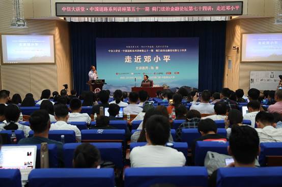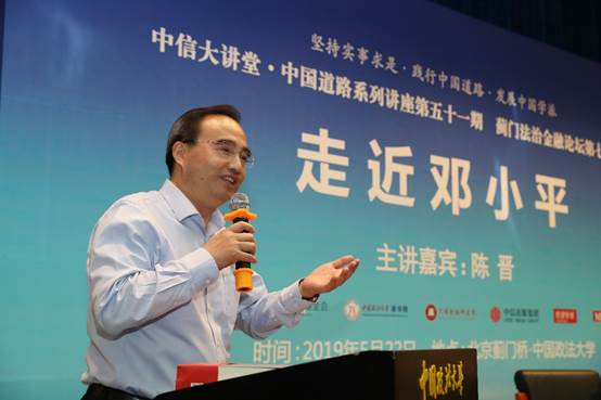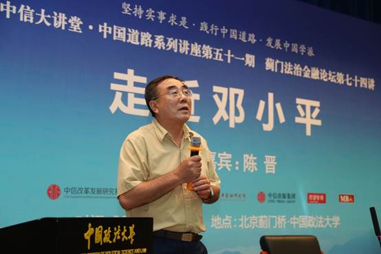 5月22日晚,中信大讲堂•中国道路系列讲座第51讲暨蓟门法治金融论坛第74讲在威尼斯432888cam学院路校区科研楼学术报告厅举行。本次论坛邀请原中共中央文献研究室副主任、全国人大外事委员会委员、中信改革发展研究院资深研究员陈晋作为主讲嘉宾,主题为《走近邓小平》。中国工商银行原行长、中国中共文献研究会副会长、中国中共党史学会副会长杨凯生,国务院国资委资本局局长李冰,国家创新与发展战略研究会副会长、中国国际战略学会高级顾问郝叶力,中信改革发展研究基金会秘书长郭克彤,国家开发银行贷款审查委员、前中非发展、中葡合作基金董事长迟建新,金鹰红利基金独立监事、原北京证券业协会理事长姚万义,北大纵横管理咨询公司总裁、北大纵横管理集团创始人王璞等校外嘉宾,威尼斯432888cam校长黄进教授,商学院党委书记李欣宇教授等20余位教师代表,及学生代表200余人参加了论坛。商学院院长、资本金融研究院院长刘纪鹏教授担任论坛主持。