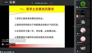 在辅导员贾老师和吴老师为同学们介绍过商学院基本概况和疫情防控纪律之后,教学科研办冯老师为同学们讲解了商学院第二学士学位的培养方案及课程、考务安排,就业中心孙老师为大家介绍了相关的就业政策和需要履行的相关手续。两位老师的介绍对于同学们接下来两年的学业和就业安排有着重要的意义。在这之后,党务办公室主任徐老师为大家介绍了双学士党员发展、党员教育管理和党组织关系转接等内容。这对同学们接下来的个人规划和自身发展有着指导作用。