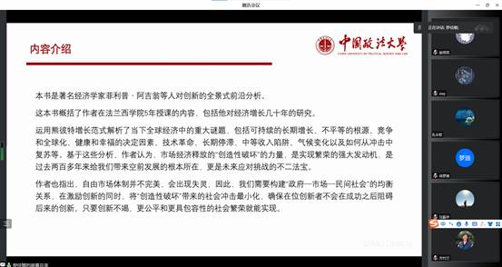商学院工商管理系、工商管理党支部研究生第29期读书研讨会于2022年11月10日晚以腾讯会议的方式顺利举行。本次读书会由张艾嘉同学主持,2020级企业管理硕士生罗佳敏和2021级企业管理硕士生刘家祺同学主讲。参与本次读书会的有我院工商管理系郭颖老师、王玲老师、马克态老师、葛爽老师、张亚琼老师、王尧老师、创新经济学特聘博导方竹兰老师以及2021级、2022级企业管理全体研究生,大家围绕党的二十大与葛爽老师推荐的《创造性破坏的力量》一书的内容展开了讨论。