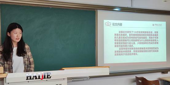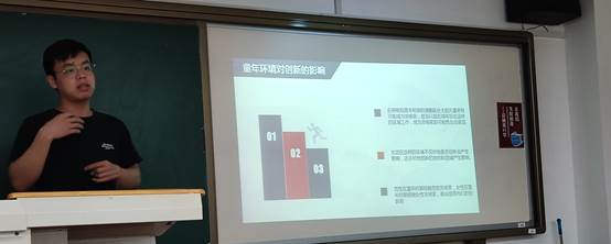 杜函辉同学首先介绍了本篇论文所用的数据、发明者的出生特征、童年环境与接触创新的情况;进而介绍了论文的主要内容——文章利用数据分析了家庭出身、童年环境对个人创新能力的影响,以及发明者的职业轨迹;并概括了论文的研究结论——童年时期接触创新对个人以后成为发明者有着显著的影响;最后他结合熊彼特的创新理论提出了该文对我们的政策启示,应当加大教育投资力度,鼓励发展职业教育,完善收入分配机制,缩小贫富差距,创造良好的创新环境。
