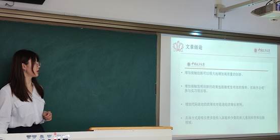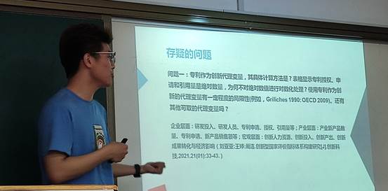 左煦冬同学介绍了文章的实证部分,并就以下问题与大家交流:专利作为创新的代理变量,其具体度量方法是什么?他认为使用专利作为创新的代理变量具有一定局限性,也可以考虑采用其他宏观层面、产业层面或微观层面的变量作为创新能力的代理变量。