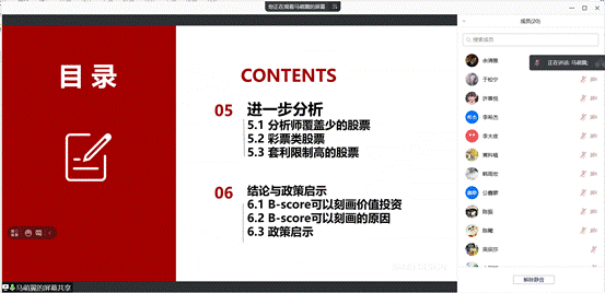 首先单淼同学向大家介绍了这篇论文的内容概括和结构。此论文以来自CSMAR数据库的2005年1月至2016年12月沪深两市A股数据为研究对象,借鉴Fama-French的三因子模型,构建了一个涵盖了Safety、Cheapness和Quality这3个维度的综合性指标:B-score,并采用单变量分组、多变量分组检验以及Fama-Macbeth回归等方法对模型进行检验;接着,余清雅同学就单变量分组检验、多变量分组检验以及Fama-Macbeth回归等方法对模型检验的结果进行了讲述。余清雅同学讲到,以上三种检验方法得出的结果是一致的,B-score策略对横截面股票的收益率有很强的预测作用,而且综合性的B-score比各维度的指标Safety、Cheapness以及Quality对收益率的预测能力更显著;然后马萌翼同学介绍了论文的稳健型检验部分,研究发现,在不同市场状态下,无论是牛熊市还是市场相对乐观或者相对悲观,B-score 策略都有稳健的收益率,且 B-score 策略的表现受财报质量的影响不大;接下来,于松宁同学对论文后面提出的三个假说进行介绍,即分析师覆盖少、彩票类股票和套利限制高的股票中B-Score策略的盈利性更强,并对这三个假说进行了实证检验。检验证明了前两个假说的正确,并分析了第三个假说不正确的原因是因为中国股票市场缺乏有效的套利机制。并根据以上的内容提出了相应的政策建议。