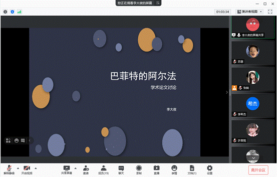 2021年6月21日上午,我院资本金融系和国商会计党支部成功合办2021春季学期第二期研究生线上读书会。本次读书会由商学院资本金融系副系主任李大夜老师和李伯尧老师共同指导,以李大夜老师推荐的《巴菲特的阿尔法:来自中国股票市场的实证研究》为研读文献,2020级金融硕士余清雅、于松宁、马萌翼、单淼四位同学主讲,2020级金融、国际商务专业的同学参加了本次读书会。