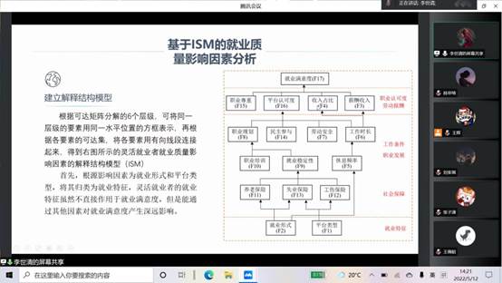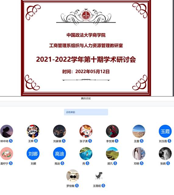商学院工商管理系组织与人力资源管理教研室于2022年5月12日14:00在腾讯会议线上召开第十期组织与人力资源管理学术研讨会,会议主题为“前沿论文导读与论文写作汇报”,由工商管理系王辉老师主持,李世清、张子潇两位同学进行论文写作汇报,罗佳敏同学进行前沿论文导读。组织与人力资源管理教研室王霆老师、顾凡老师、王尧老师、邓晓老师和学术研究生莫柠宁、王薇昭、林申琦、刘家祺出席。