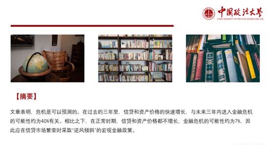 首先由胡良福同学介绍了第一篇文献《预测金融危机》。然后胡良福同学引入文章的重要结论——金融危机是可以预测的。如果在过去的三年里,信贷和资产价格的快速增长,则与未来三年内进入金融危机的可能性约为40%有关。相比之下,在正常时期,信贷和资产价格都不增长,金融危机的可能性约为7%,因此应在信贷市场繁荣时采取逆周期的宏观金融政策。