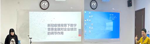 最后,2020级西方经济学专业硕士研究生石思雅汇报论文的题目是《新冠疫情背景下数字普惠金融对企业绩效的调节作用》。她从“新冠疫情相关研究”与“数字普惠金融对企业业绩的影响”两方面进行综述,并提出四个研究假设,基于国泰君安数据库,选择2019年第1季度至2020年第1季度的主板上市公司为研究样本,构建实证模型,最终得出两个研究结论:即新冠疫情给企业业绩带来负面影响,且存在行业异质性,对服务业企业的影响更为明显;数字普惠金融所发挥的调节作用能够缓解新冠疫情给企业业绩带来的不利冲击,且该调节作用对中小企业更为显著。