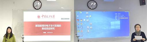 2020级政治经济学硕士研究生贾丽璇汇报的题目是《新冠疫情对电子支付发展的推动效应研究》。她从研究背景、文献综述、疫情后的发展、原因剖析四方面展开论述,认为中国成为新冠疫情下唯一一个经济正向增长的主要经济体,国家的迅速反应、医疗技术水平、电子支付水平的提升使得中国经济平稳运行。